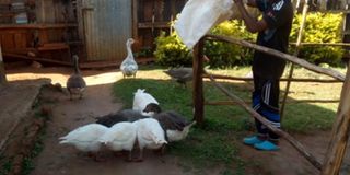 Former Harambee Starlets skipper Mary Kinuthia feeds her poultry in her farm in Kitale.