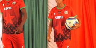 National Football team players Robinson Kamura (left) and Mary Kinuthia model playing kits on May 22, 2017 when the Football Kenya Federation and Mafro Sports Apparel signed a deal. Chris Omollo | Nation Media Group