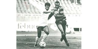 Kenya Breweries midfielder Mohammed Nazir “Tostao” vies for the ball with AFC Leopards winger Dan Shikanda during the 1989 Moi Golden Cup final at Moi International Sports Centre, Kasarani. Breweries won 5-4 on penalties after a 1-1 draw in regulation time.