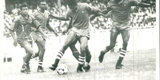 Kenya’s Mohammed Nazir (left) and Mike Okoth (hidden at centre) try to stand their ground in the relentless midfield battle with the Sudanese during their 1992 Africa Cup of Nations qualifying match at Moi International sports Centre on July 28, 1991. Kenya won 2-1. FIL