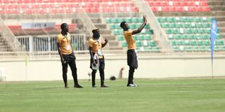 Let's take a 'selfie'! Zambian stars feel the pitch at the Nyayo National Stadium before the warm up.