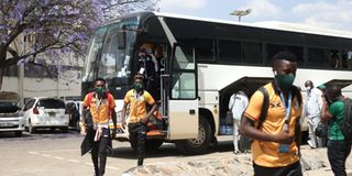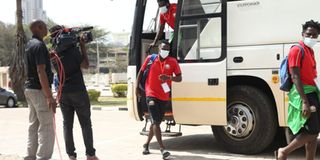 Harambee Stars players arrive at Nyayo National Stadium ahead of the match.