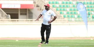 Harambee Stars coach Francis Kimanzi on the pitch at Nyayo before the pre-match warm up.