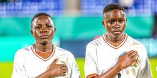 Junior Starlets strikers Valarie Nekesa (left) and Joan Ogola participate in the national anthem ceremony before their Group 'C' match at Felix Olimpico Stadium in Santo Domingo on October 23, 2024, during the Under-17 Women's World Cup in the Dominican Republic.