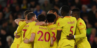 Liverpool's German-born Cameroonian defender Joel Matip celebrates with teammates after scoring his team second goal during their English Premier League match against Southampton at St Mary's Stadium in Southampton, southern England on May 17, 2022.