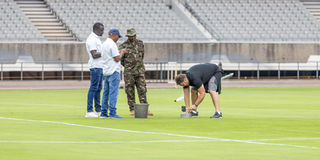A CAF officer inspects the grass at Moi International Sports Centre Kasarani in Nairobi on May 24, 2025.