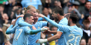 Manchester City's Erling Braut Haaland (second left) celebrates scoring their second goal with teammates during their English Premier League match against Everton at Etihad Stadium on February 10, 2024.