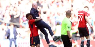 FA Cup - Final - Manchester City v Manchester United - Wembley Stadium, London, Britain - May 25, 2024 Manchester United's Lisandro Martinez and manager Erik ten Hag celebrate after winning the FA Cup.
