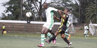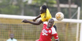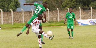 John Makwata of Ulinzi Stars (right) vies with Mark Odhiambo of KCB during their Kenyan Premier League encounter at Afraha Stadium in Nakuru on June 7, 2015.