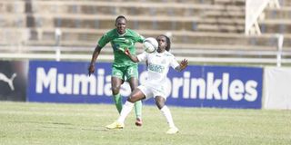 KCB defender Mark Odhiambo vies for the ball with Gor Mahia forward Dan Sserunkuma during their Kenyan Premier League match at Nyayo Stadium on August 28, 2014.