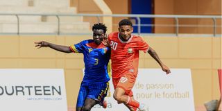 Harambee Stars midfielder Adam Wilson (right) tussles for the ball with Chad's Haroun Abakar (left) during their international friendly match played at Marrakech Stadium in Morocco on June 7, 2025.