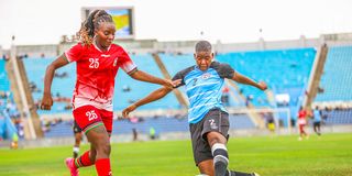 Harambee Starlets winger Elizabeth Wambui (left) vies for the ball with Botswana midfielder Dithebe Keutumtse at The National Stadium in Gaborone, Botswana during the second match of their 2024 Women Africa Cup of Nations (WAFCON) qualifying match on December 5, 2023.