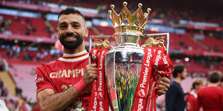 Liverpool's Mohamed Salah celebrates with the English Premier League trophy after their match against Crystal Palace at Anfield, Liverpool in Britain on May 25, 2025.