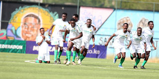 Mara Sugar players celebrate after winning the penalty shoot out against Kenya Police during their Mozzart Bet Cup quarter-final match at Dandora Stadium on May 25, 2025.