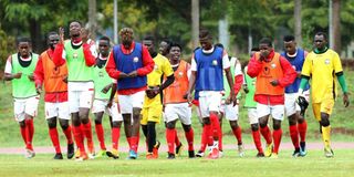 Harambee Stars players jog during a training session at Moi International Sports Centre, Kasarani on November 5, 2020 in preparation for Africa Cup of Nations qualifiers against Comoros.
