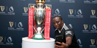 Nation Media Group senior reporter Elvis Ondieki takes a selfie next to the English Premier League trophy at Nation Centre in Nairobi on October 25, 2025.