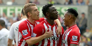 Southampton's Kenyan midfielder Victor Wanyama (centre) is congratulated by teammates after scoring the only goal of the English Premier League football match between Swansea City and Southampton at the Liberty Stadium in Swansea, south Wales, on September 20, 2014. Southampton won 1-0. PHOTO | GEOFF CADDICK |