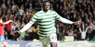 Celtic’s Victor Wanyama celebrates scoring against Helsingborgs during their Uefa Champions League play-off, 2nd leg at Celtic Park on Wednesday night. Celtic won 2-0. Photo/AFP