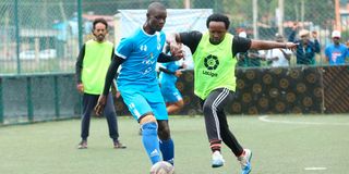Nation FC'S Eric Musungu (left) vies for the ball with Anthony Irungu of BBC during the Sports Journalists Association of Kenya(SJAK) Inter-Media football tournament at Galleria on July 1, 2023.