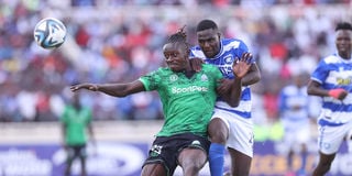 Maxwell Otieno (right) of AFC Leopards fights for the ball with Levin Opiyo of Gor Mahia during their Football Kenya Federation Premier League match at Nyayo National Stadium on March 30, 2025.