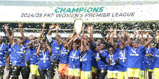 Kenya Police Bullets players celebrate with the title after winning the 2024/2025 Football Kenya Federation Women’s Premier League (FKF-WPL) title after beating Trinity Starlets at Afraha Stadium in Nakuru County on May 25, 2025.