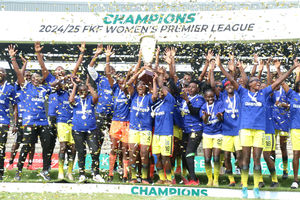 Kenya Police Bullets players celebrate with the title after winning the 2024/2025 Football Kenya Federation Women’s Premier League (FKF-WPL) title after beating Trinity Starlets at Afraha Stadium in Nakuru County on May 25, 2025.