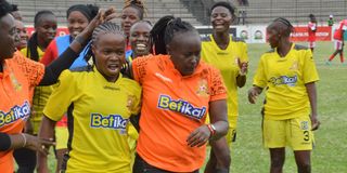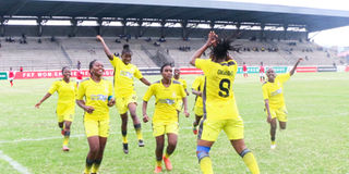 Kenya Police Bullets striker Rebecca Okwaro celebrates her goal with teammates during their Football Kenya Federation Women’s Premier League (FKF-WPL) match against Trinity Starlets at Afraha Stadium in Nakuru County on May 25, 2025.