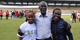 Rebecca Okwaro of Kenya Police Bullets (left) pose for a photo with her dad, Julius Okwaro (centre) and her sister, Jane Okwaro, after her team beat Trinity Starlets 4-0 to win the FKF Women Premier League's title at Afraha Stadium, Nakuru on May 25, 2025. Rebecca finished as top scorer of the league with 16 goals.