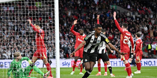 Newcastle United's Alexander Isak celebrates scoring a goal against Liverpool during Carabao Cup final at Wembley Stadium in London on March 16, 2025.