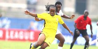 Kenya Police Bullets’ leading striker Rebecca Okwaro (left) vies for the ball with Lavenda Akinyi of Ulinzi Starlets during their FKF Women’s Premier Legue match at Police Sacco Stadium on October 19, 2024. Okwaro is the league’s joint top scorer on 15 goals.