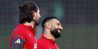 Liverpool's Mohamed Salah with Dominik Szoboszlai during training at AXA Training Centre, Liverpool, Britain on December 8, 2025.