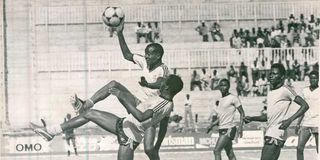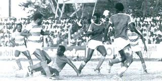Barclays Bank striker shoots to score past Speedways FC striker J.J. Masiga Cup match at Nyayo National Stadium in 1990. AFC Leopards perfected the sue of secret codes in competitions to win matches in the 60s, 70s, and 80s.