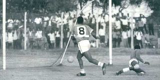 Abaluhya Football Club’s Joe Kadenge (right)shoots to score past Luo Union’s goalkeeper, John Baptists, on January 13, 1968. F