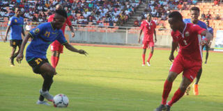 Kenya's Clifton Miheso (right) vies for the ball with a Tanzanian player during their Africa Nations Championship (Chan) first leg of the first round qualifier at the National Stadium in Dar es Salaam on July 28, 2019.