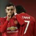Manchester United midfielder Bruno Fernandes reacts during their English League Cup semi-final match against Manchester City at Old Trafford in Manchester, England on January 6, 2021.