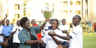 Sports Registrar Rose Wasike (left) hands over the Kenya Hockey Union men's Premier League trophy to Kenya Police captain Oliver Echenje (right) and the late Kenya Police coach Kenneth Kaunda's wife Amina Juma Kaunda (centre) at City Park Stadium.