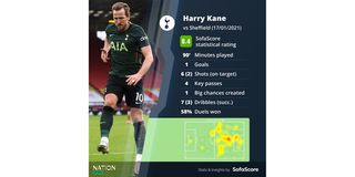 Tottenham striker Harry Kane's statistics against Sheffield United. sofascore.com|
