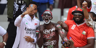 Kenyan fans cheer Harambee Stars during their CHAN match at Moi International Sports Centre, Kasarani on August 17, 2025.
