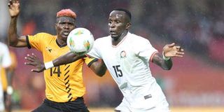 Harambee Stars strike Ryan Ogam (left) fights for the ball with a Zambian player during their 2024 Chan Group 'A' match at Moi International Sports Centre, Kasarani in Nairobi on August 17, 2025.