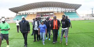 Officials from the Ministry of Education inspect Bukhungu Stadium in Kakamega yesterday. The facility will host East Africa secondary school games from August 14 - 25.