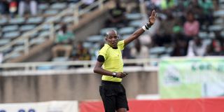 Fifa referee Peter Waweru gestures during an international friendly match between Kenya's Harambee Stars and Uganda Cranes at Moi International Sports Centre, Kasarani on September 8, 2019.