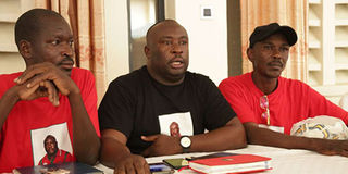 Kisumu All Stars CEO Nicholas Ochieng’ (centre) addresses a presser on the sidelines of a meeting with club representatives at a hotel in Kisumu on January 26, 2020.