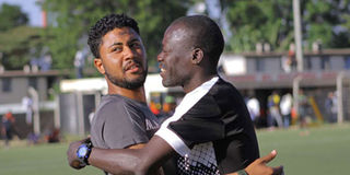 Wazito coach Ahmed Mohamed (left) hugs Kisumu All Stars coach Francis Oduor after their National Super League match at Camp Toyoyo, Nairobi on January 19, 2019.
