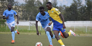 Western Stima striker Hassan Kiyoyo (right) vies for the ball with Kisumu All Stars defender Seth Oyugi during their Kenya Premier League match at Moi Stadium, Kisumu on September 28, 2019.