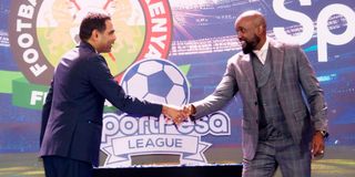 FKF President Hussein Mohammed (left) and Sportpesa CEO Ronald Karauri after unveiling FKF Kenya Premier League to Sportpesa Premier on September 16, 2025, at Glee Hotel in Kiambu County.