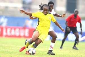 Harambee Starlets' Lavender Akinyi dribbles the ball past Uganda's Eva Nagayi during Fifa Under-20 Women World Cup qualifiers on September 25, 2021, at Nyayo National Stadium.