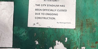 A notice pinned on Nairobi City Stadium's main gate indicates the 6,000 seater facility has been temporarily been closed "due to ongoing construction."