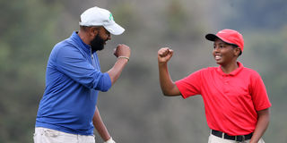 Limuru Country Club's Owen Kangethe (right) greets club mate Nick Ngare during the Serena Golf Day at Limuru Country Club on September 5, 2020.