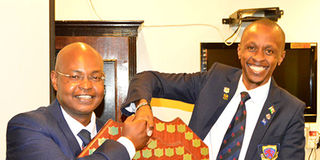 New Kenya Golf Union chairman Anthony Murage (left) receives the KGU shield from outgoing chair Lucas Maranga during the handover ceremony on May 27, 2019.