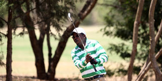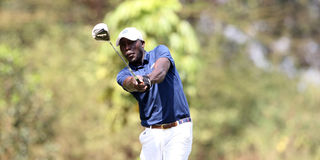 Ruiru Sports Club's Bernard Omondi follows the progress of his shot during the Ruiru Classic Golf tournament at the par 72 Ruiru Sports Club on August 29, 2020.